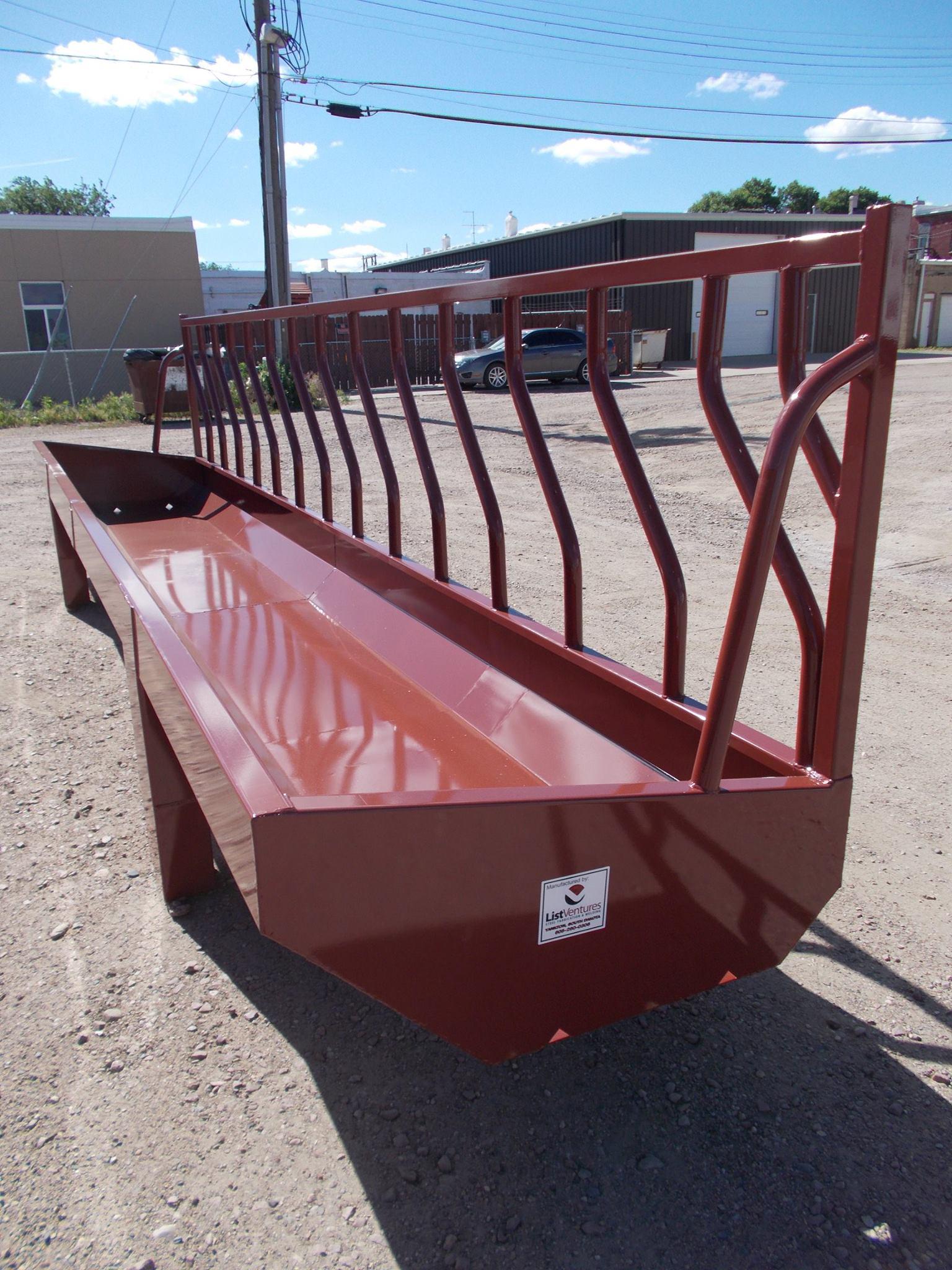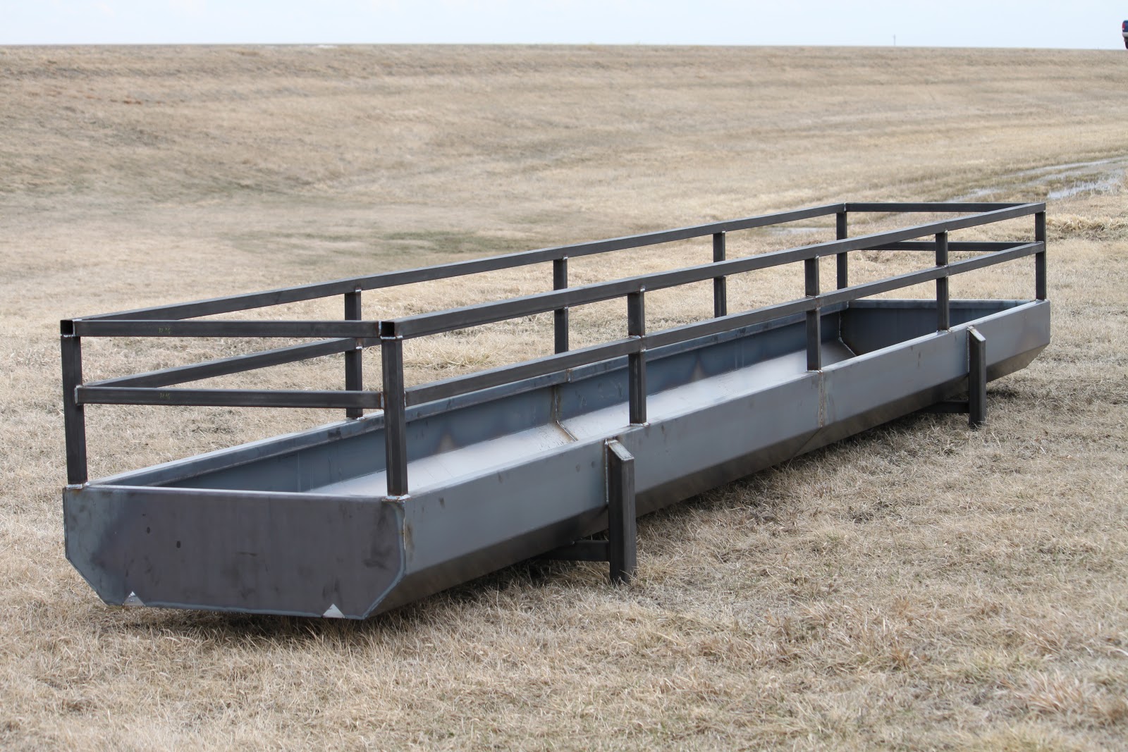 Heavy metal feed bunks are made of 10 gauge sheet material with rectangular tubing legs capped on the top and bottom. Top lip is formed in and down to keep the feed in the bunk. Two drain holes in both ends. Available painted or unpainted. Leg under bunks also available.