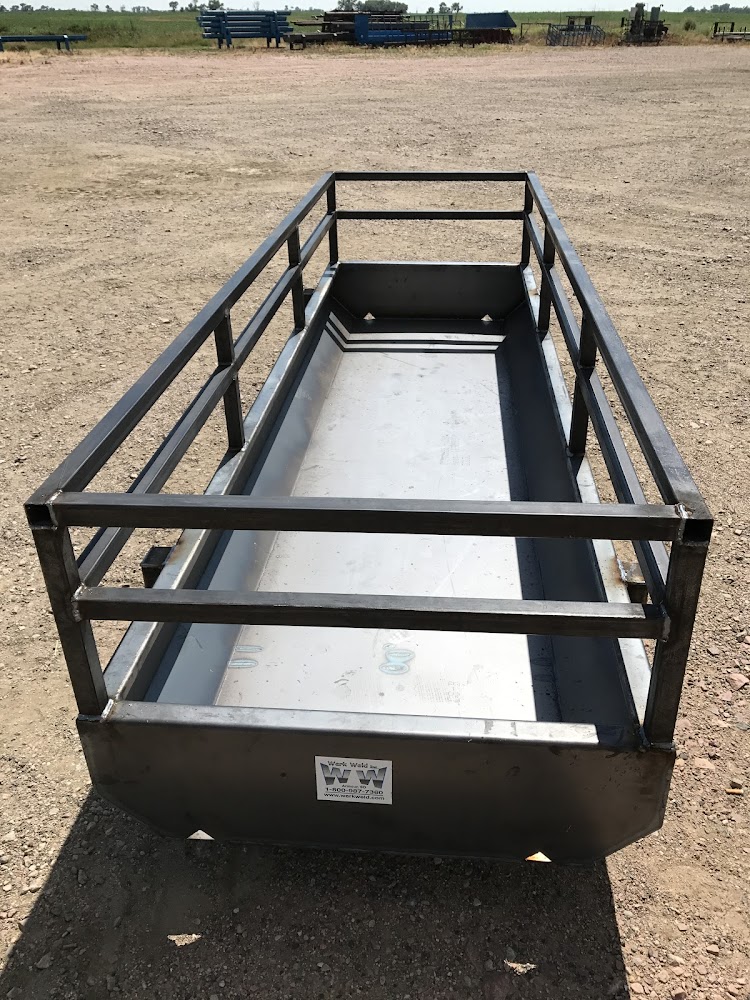 Cow Fenceline - The bunk is made with 10 gauge sheet material and 1-1/2" 12 gauge square tube fence. The legs are capped on the bottom with a plate to anchor them in place. Top feed saver lip. Bunk weighs approximately 1000 lbs.